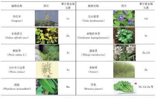 Baker等首次以田间试验形式研究了Zn和Cd的超累积植物Thlaspi caerulescens;Ebbs等通过实燕麦对重金属Zn 的吸收效果发现有很好的效果;Blaylock等发现芥菜(Brassica juncea)可以吸收和积累Pb、Cd、Zn等多种重金属,并且菥蓂可以有效吸收Zn、Pd、Cd;Antiochia等实验发现香根草对Zn也有着较好的富集作用。此外还发现庭芥属(Alyssum bertolonii)可富集Ni;遏蓝菜(Thalspica-reulesences)可以富集Zn和Cd。几种超累积植物及其富集重金属元素如表1所示。