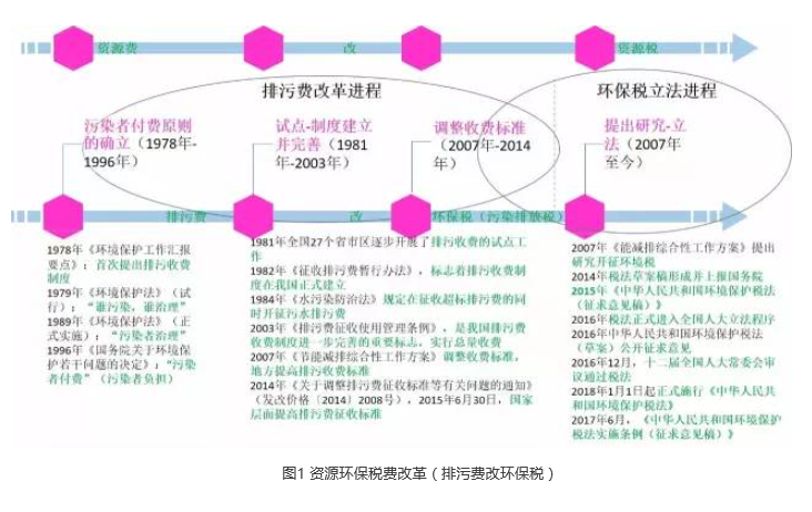 我国的排污费改环保税(污染排放税)经历了四个阶段,污染者付费原则确立阶段、试点-制度建立并完善阶段、调整收费标准阶段、环保税提出研究-立法阶段(具体进程如图1所示)。在环保税法通过半年后(6月26日),公众得以正式参与建言献策,财政部、国家税务总局、环境保护部发布《中华人民共和国环境保护税法实施条例(征求意见稿)》。