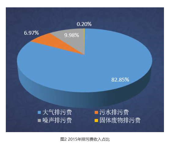中国环境工业促进会会长杨朝飞曾提出“排污收费相当于对环境的欠量补偿,等量补偿和超量补偿”,而我国的排污收费一直处于欠量补偿阶段。另外,排污收费在全国的收费不高,大约在200亿元左右(2015年排污费收入占比如图2所示)。环保税法的发布是重大的突破,“费改税”对工业污染防治、规模化畜禽养殖治污等将发挥重大的作用(具体见图3税收征收情形)。