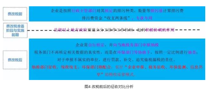 环境保护部环境规划院高树婷研究员在E20分享会上指出“由于目前环保税是由排污费进行‘税负平移’的,从总体上看,‘费改税’并不会增加行业和企业负担,但不排除个别企业因环保税征管执法刚性增强而导致税负增加,此外排污费标准调整中未涉及的污染物税额标准提高。”环境保护部环监局原巡视员汪冬青在相关会议上指出“2008年1月1日之后,仅围绕生产环节进行排污收税,一般固体废弃物的收税将会增加”。环境保护部环境规划院环境政策部主任、研究员葛察忠认为“环境保护税法开征在即,各地必须增强紧迫感,明确各部门责任,做好信息对接,抓好税务部门及企业的人员培训。特别是完成涉税信息共享平台建设、部署和调试等工作。”他还认为“对于一些大企业来说内部管理比较完善,数据核算申报等工作基础较好,而对于小企业来说,则可能存在一定困难,要加强对小企业要做好征税服务、指导工作。”费改税前后的征收对比如图4所示。