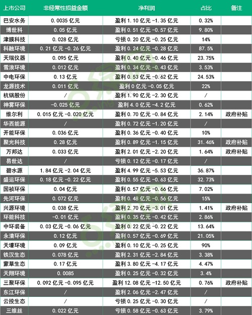 22家业绩预告中,除5家未显示产生的非经常性损益外,其他17家中有10家为盈利,2家为亏损,5家非经常性损益为政府补贴。政府补贴中,聚光科技最高获得了2800万元,其次为三聚环保接近1000万,其他的维尔利、万邦达、兴源环境基本在几百万元左右。