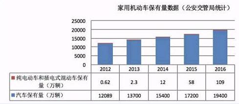 2012-2016年中国纯电动车和插电式混动车与家用机动车保有量分布柱状图