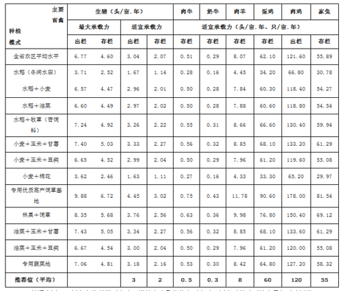 按照四川农区耕地畜禽承载能力评估和实测值,确定畜禽养殖耕地(包括农田、人工草地、人工经济林)的适宜承载力,不同种植模式单位面积耕地的畜禽适宜承载力(见表1)。表1 不同种植模式单位面积耕地当年畜禽适宜承载力