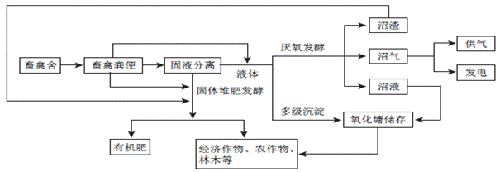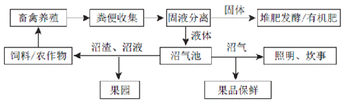 农村畜禽养殖产生的大量粪便,利用沼气技术处理生产沼气,用于照明和生活用气,沼液沼渣经处理后还田利用。以沼气工程为核心的处理模式见图3。
