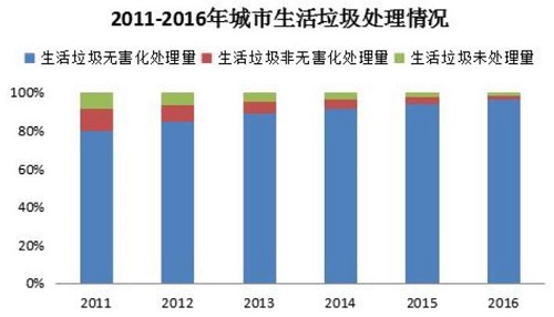 2016年年末,全国城市道路清扫保洁面积79.5亿平方米,其中机械清扫面积47.5亿平方米,机械清扫率59.7%。全年清运生活垃圾、粪便2.17亿吨,比上年增长5.3%。全国城市共有生活垃圾无害化处理场(厂)940座,比上年增加50座,日处理能力62.1万吨,处理量1.97亿吨,城市生活垃圾无害化处理率96.62%,比上年增加2.52个百分点。