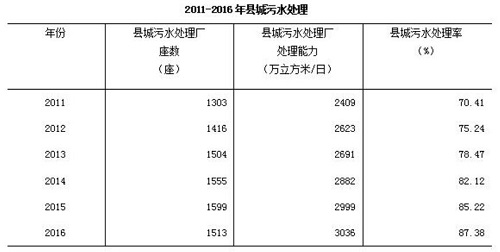 2016年年末,全国县城共有污水处理厂1513座,比上年减少86座,污水厂日处理能力3036万立方米,比上年增长1.2%,排水管道长度17.2万公里,比上年增长2.4%。县城全年污水处理总量81亿立方米,污水处理率87.38%,比上年增加2.16个百分点,其中污水处理厂集中处理率85.8%,比上年增加2.34个百分点。