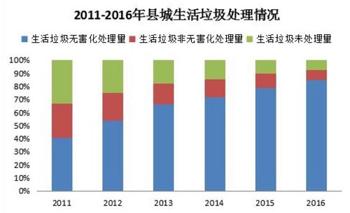 2016年年末,全国县城道路清扫保洁面积25.1亿平方米,其中机械清扫面积12.7亿平方米,机械清扫率50.7%。全年清运生活垃圾、粪便0.71亿吨,比上年减少0.8%。全国县城共有生活垃圾无害化处理场(厂)1273座,比上年增加86座,日处理能力19.1万吨,处理量0.57亿吨,县城生活垃圾无害化处理率85.22%,比上年增加6.18个百分点。