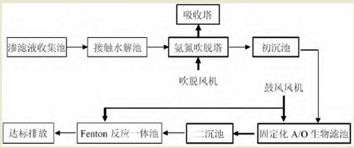 渗滤液由收集池泵入接触水解池,后进入氨氮吹脱塔,氨氮吹脱塔由pH调节池、吹脱塔、吸收塔组成,吹脱塔出水加药沉淀后进入固定化A/O生物滤池,对垃圾渗滤液中的COD、氨氮进一步去除,沉淀后出水经Fenton反应沉淀后达标排放。