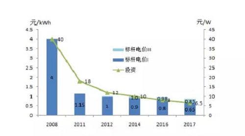光伏发电投资、发电成本和电价也实现了大幅度下降,初始投资从2010年的约20元/瓦,降到2015年的8-9元/瓦,再到2017年的6-7元/瓦,光伏发电标杆电价从2011年的1.15元/千瓦时,降到2014年的0.9-1.0元/千瓦时,再到2017年0.65-0.85元/千瓦时。2016年光伏领跑技术基地最低中标电价达到0.45元/千瓦时,中标电价水平普遍低于当年光伏标杆电价15-35%。