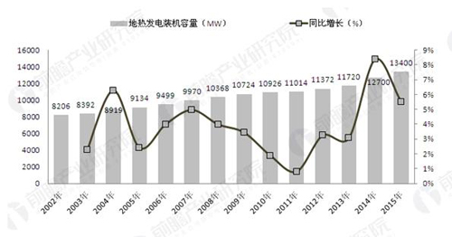 随着近年来地源热泵的兴起,地热直接利用在全球地热能开发利用中的比重有大幅度提高。2011年底,全球的地热发电累计装机容量为11.01GW。从过去十年的增长趋势来看,2007年之后的地热装机容量增速逐年下滑,2011年的增速为0.8%。2015年,全球地热发电累计装机量达到13.40GW,比上年增长5.51%。2002-2015年全球地热发电累计装机容量及同比增速(单位:MW,%)