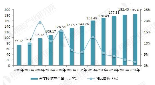 更令人担忧的是,医疗废弃物的产生量在大幅提升,进一步加剧处理医疗废弃物的压力。数据显示,我国医疗废弃物产生量已从2005年的75.12万吨增至2016年的185.49万吨。