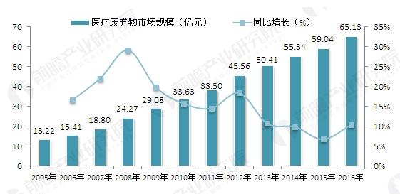 2005-2016年中国医疗废弃物市场规模及同比增长情况(单位:亿元,%)