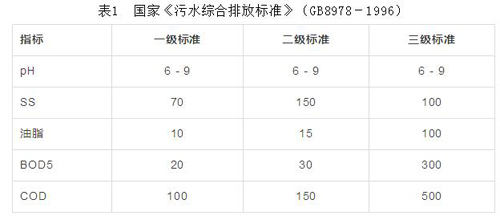 BOD为300-500mg/L,COD为1000mg/L左右,油脂为150——421mg/L,氨氮平均值6——50mg/L,SS为300——568mg/L,这些指标均高于国家《污水综合排放标准》(GB8978——1996)中规定的排放浓度(见表1),其中油脂,BOD,COD,SS要远远高于三级标准,餐饮废水在处理达到三级标准后,才能排入有污水处理厂的城市管网。