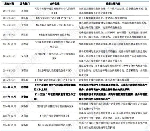 数据来源:前瞻产业研究院整理十三五期间,环境监测政策扶持力度持续加码,一方面新环保法、水十条、生态环境监测网络、互联网+绿色生态等重磅政策陆续地出台,环境监测原有市场领域将进一步拓宽;另一方面,随着VOCs政策密集发布,土十条顺利发布,设臵水、大气、土壤三个环境管理司等因素,环境监测的新市场领域巨大。