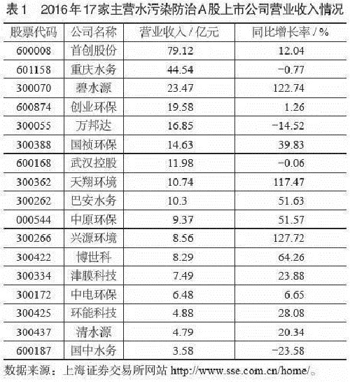 2016年国务院颁发《“十三五”生态环境保护规划》中明确指出要“完善环境标准和技术政策体系。研究制定环境基准,严格执行污染物排放标准,建立生态保护红线监管技术规范”。因此,工业点源的环境守法不仅在于自身处理废水的能力升级,更多地依赖于水污染防治相关企业的技术、产品和服务是否能够解决企业排放“如何达标”的问题。目前我国A股市场共有92家环保上市公司,环保业务收入占主营业务收入比例大于50%的公司共39家,其中17家为主营水污染防治公司(表1)。