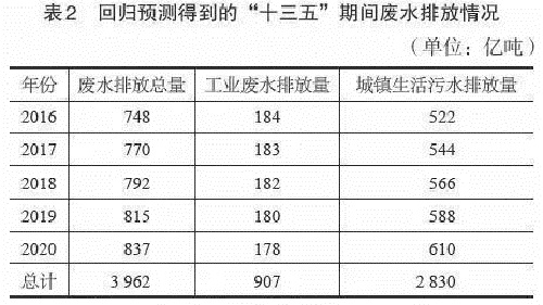若污水处理排放标准从二级标准提高到一级A标准,以污水运行率70%计算,日处理能力在2000吨——50万吨左右的城镇污水处理厂将增加投资成本623——323元/吨,增加的运行成本为0.11——0.2元/吨。根据回归模型外推(图2),预测得到“十三五”期间废水排放总量约为3962亿吨,预计平均每年城镇生活污水排放量约为566亿吨(表2),按照日处理能力在1万吨的污水处理厂的标准,二级标准提高到一级标准所增加的投资费用约为514元/吨,初步估算《标准》修订后,城镇污水处理厂将年均增加建设与运营投资超过700亿元。