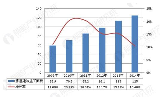 2009-2014年,全国建筑业房屋建筑施工面积逐年增长,年增长率均维持在10%以上,2014年建筑业房屋建筑施工面积为125亿平方米,同比增长10.40%;全国房地产开发投资95036亿元,比上年名义增长10.5%,增速为近11年以来最低值。2009-2014年我国建筑业房屋建筑施工面积及同比增速(单位:亿平方米,%)