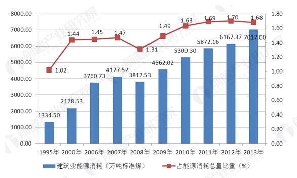 资料来源:前瞻产业研究院《中国建筑节能行业分析报告》在此背景下,我国建筑行业能源消耗不断增长,2013年为7017万吨标准煤,较1995年的1334.50万吨标准煤增长5倍,虽然建筑业整体消耗占比较低,但从其占总能源消耗的比重来看,建筑行业能源消耗占比总体呈上升趋势,由1995年的1.02%上升至2013年的1.68%。