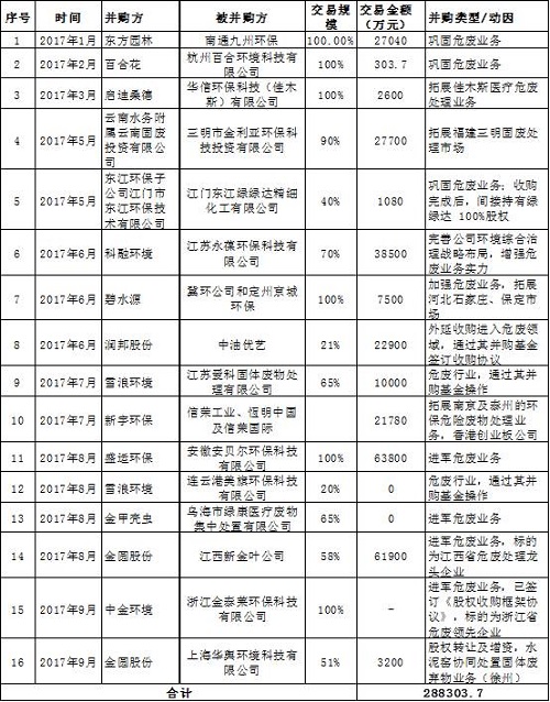 基于调查数据等,业内预计“十三五”期间危废市场空间可达2000亿。进入2017年以来,危废行业发起并购行为16起,累积交易金额28.83亿元,群雄并起,纷纷跑马圈地,正奋力抢占这块不容错过的“香饽饽”。而危废行业新格局将在此轮并购潮加快形成。