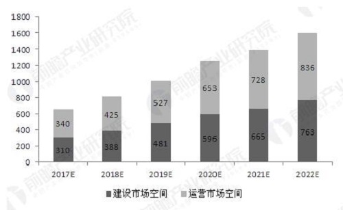 2014年垃圾焚烧投运产能约20万吨/天,为后续提供年均约174亿的存量运营市场。未来随着新建产能相继投运,将从建设和运营两个方面带来增量市场。根据25%的产能投放增速假设,预计2017年有望达到39万t/d产能。综合考虑存量和增量市场,预计到2022年,我国垃圾发电行业建设市场空间为763亿元,运营市场空间达836亿元,总市场规模将接近1600亿元。2017-2022年垃圾发电行业市场规模预测(单位:亿元)