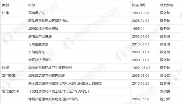 我国国家及地方建筑垃圾处理相关法律法规归纳如下表所示。