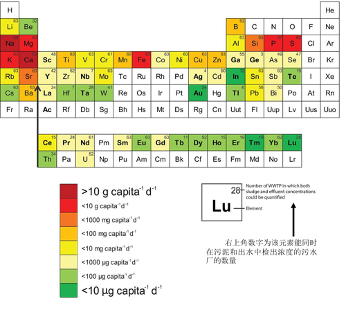 研究团队根据瑞士全国人口和测得的元素含量来计算出各元素的人均每日排放量。计算结果显示,各元素浓度差异较大,从几微克(例如金、铟、镥)到几毫克(如锌、钪、钇、铌、钆),甚至到超过每天1克(磷、铁、硫 )的都有。