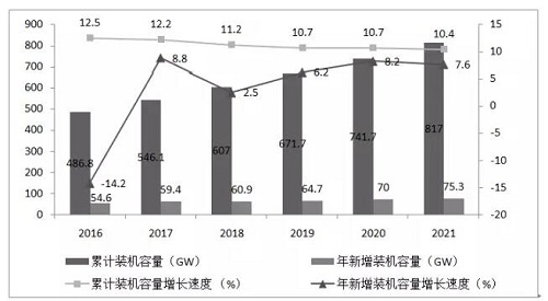 2016—2021年全球风电装机容量市场预测(GW,%)(来源:中国经济信息社整理)