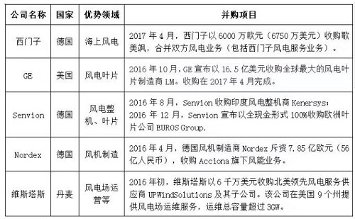 2016—2017年全球风电领域重要并购项目(来源:中国经济信息社整理)