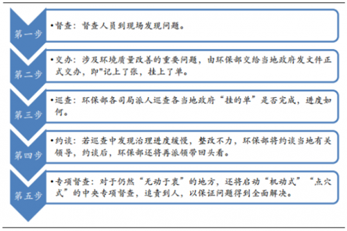 2017年6月27日,环保部新部长李干杰上任,提出五步工作法,将工作重心放在在督查发现问题之后,如何解决问题,将更加关注事后,环保压力持续加码。环保督查五步工作法
