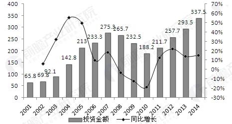 资料来源:《前瞻产业研究院大气污染治理行业报告》为此,我国政府不断加大大气污染治理投资力度。2001-2007年,投资额逐年增长,年均增长率在25%以上,2008-2010年,工业污染治理投资整体规模有所缩减,大气污染治理投资额也有所下降。2013年,全国大气污染治理投资总额约293.5亿元,同比增长13.89%。2014年全国大气污染治理投资总额约337.5亿元,同比增长14.99%。