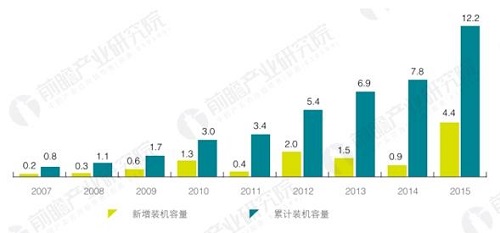 据统计,2015年,全球海上风电新增装机容量达到4.4GW,累计装机容量达12.2GW,新增装机容量同比增长389%,相当于之前三年新增装机容量总和。新增装机容量大幅度增长的主要原因是不分德国和英国大型海上风电项目建设完工日期由2014年延期至2015年。2007-2015年全球陆上风电新增与累计装机容量(单位:GW)