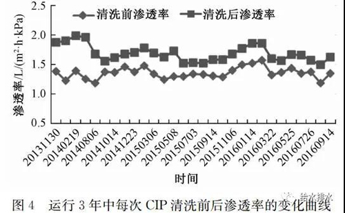 从图4中可以看出,3年中,CIP清洗前的渗透率变化范围在1.189——1.579 L/(m2˙h˙kPa),平均为1.358 L/(m2˙h˙kPa)。CIP清洗后的渗透率变化范围在1.495——1.987 L/(m2˙h˙kPa),平均为1.687 L/(m2˙h˙kPa)。渗透率随着季节有规律地波动,一般在冬季较高,夏季较低。