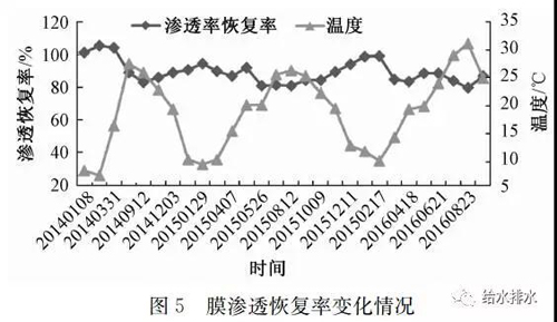 同时,从图5中也可以发现,渗透恢复率随着温度的升高,有所降低。这可能与渗透率计算过程中,修正系数的值有关。也可能与季节温度不同时,膜受的污染不同有关,在温度低的季节,膜受的污染比较容易恢复,而在温度高的季节,膜受的污染不容易恢复。