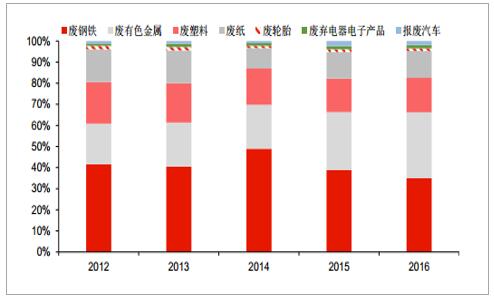 从回收品种看,普遍存在“利大抢收,利小少收,无利不收”的现象,基本上以价值较高的废钢铁、废有色金属、废塑料及废纸为主,基本形成了较完整的回收利用产业链。但废玻璃、废电池、废节能灯、废纺织品等品种,由于回收成本高、利用价值较低和利用水平有限等多种因素,回收率较低。企业在完成回收及分类后,直接贩卖给下游的加工企业,作为中间差价的获取者,利润相对稀薄。2012-2016年主要再生资源类别回收价值占比