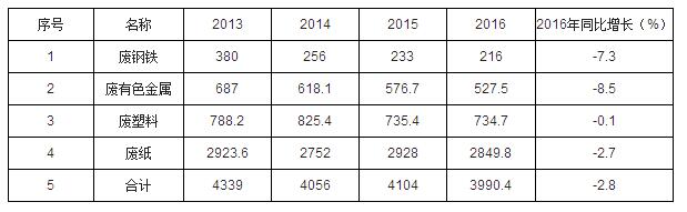 目前我国进口再生资源中以废钢铁、废有色金属、废塑料和废纸为主,其中废有色金属、废塑料、废纸进口占比达40%。2013-2016年我国主要进口再生资源总量呈下降趋势,2016年主要进口再生资源总量为3990.4万吨,为近些年最低值。禁止洋垃圾入境不仅会强化国内资源节约集约利用,全面提升国内固体废物无害化、资源化利用水平,逐步补齐国内资源缺口;而且在一定程度上缩减供给量,国内再生资源企业的原材料转向国内,原先主要依靠洋垃圾存活的中小企业或受制于原料供应逐渐退出市场,利好行业龙头。2016年,我国废钢铁、废有色金属、废塑料、废纸四大类别的再生资源共进口3990.4万吨,同比减少了2.8%。废钢材和废有色金属进口量持续下降,相比2013年,下降幅度达43.16%和23.22%,2016年同比下降7.3%和8.5%。2013-2016年我国主要再生资源进口一览(万吨)