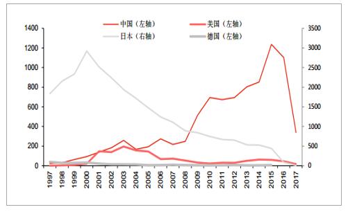 中国、美国、德国、日本固废处理专利年申请量对比