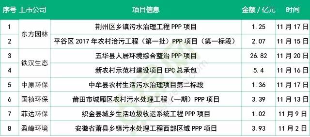 据点绿网统计,11月初至11月22日环保企业已经共中标8个农村项目(10月仅5个农村项目),涉及金额为45.24亿元。农村污水处理项目占6个,其中1个系铁汉生态中标的环境综合整治项目(包含农村生活污水处理和美丽乡村建设两部分),该项目总投资额26.82亿元为11月农村项目中最高的金额。铁汉生态中标的另一个项目为新农村建设项目,主要是对农村环境综合整治、公共基础设施建设、绿化美化等。最后1个项目为城乡垃圾收运项目,被刚刚将产业链拓展至固废领域的菲达环保夺得。
