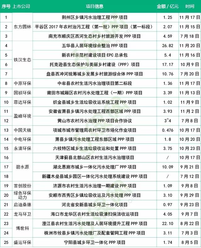 2017年下半年至今,环保企业共中标25个农村环保项目,涉及金额逾133亿元。其中污水处理项目15个(有2个项目同时还涉及垃圾收集和美丽乡村建设),6个固废项目,4个美丽乡村建设项目。