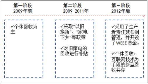 电子拆解产业主要是从家电卖场、废旧电器回收企业或个人等渠道收购废旧电器,拆解成无法出售的电子垃圾和可以出售的资源化产品,电子垃圾进一步交由危废处置企业进行处理,而资源化产品则销售给资源回收企业。电废回收行业发展三阶段