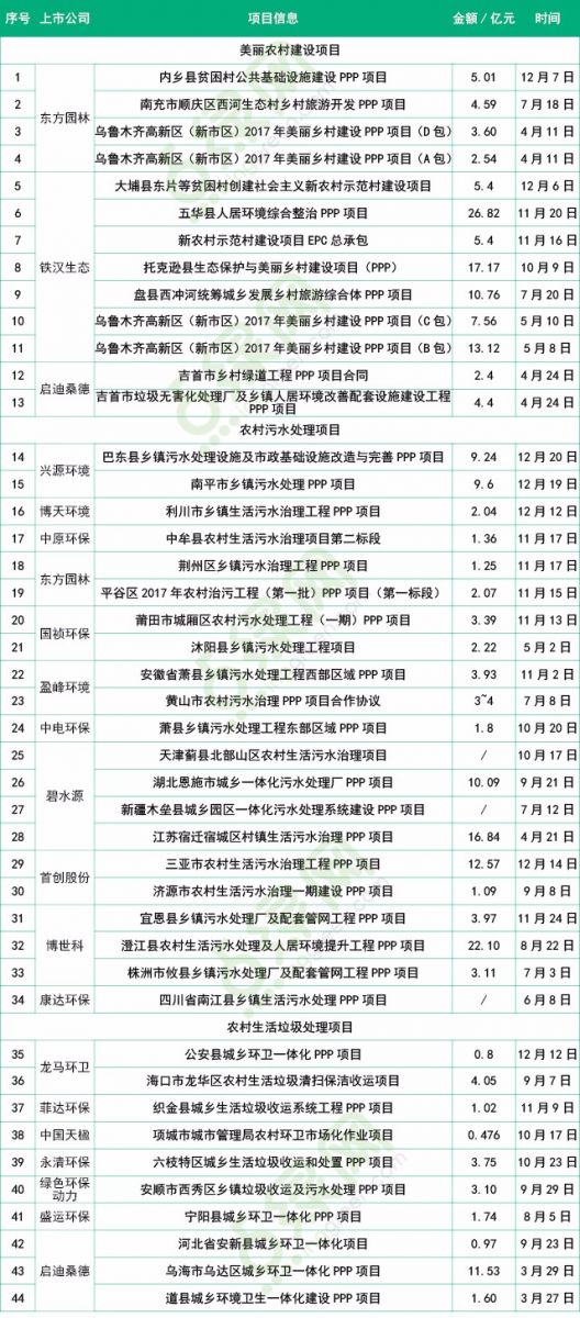 其中美丽乡村建设项目13个,涉及金额为108.77亿元;农村生活污水处理项目21个,涉及金额为110.17亿元(有3个项目金额未提及);农村生活垃圾处理项目10个,涉及金额为29.04亿元。