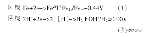 所用材料的铸铁屑和活性碳或焦碳,铸铁屑是铁和碳的合金,其内部主要由纯铁和碳化铁(Fe3C)组成,其中Fe3C以极为细小的微粒分散在铁屑内。当将铸铁铁屑浸没在电解质溶液中时,由于Fe3C比纯铁更耐腐蚀,二者之间存在着明显的氧化还原电势差,这样便在纯铁和碳化铁之间形成了无数多个细微原电池,纯铁为阳极,Fe3C为阴极。另一方面铁屑与活性碳形成较大的原电池,铸铁为阳极,碳为阴极,使铁屑在受到微原电池腐蚀的基础上,又受到较大原电池的腐蚀。在这些细微原电池中,阳极在电池反应中表现为失去电子被氧化,而阴极得到电子被还原,但反应比较复杂。在微电池中电极反应为: