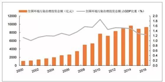 2000-2016年,我国环境治理投资总额从1014.90亿元增长至2016年的9219.80亿元,复合增速达14.79%。2016年,我国环境治理投资占GDP比例为1.24%。根据国际经验,当治理环境污染的投资占GDP的比例达1%——1.5%时,可控制环境恶化的趋势,当该比例达到2%——3%时,环境质量可有所改善。发达国家在20世纪70年代环境保护投资占GDP的比例已达2%《全国城市生态保护与建设规划(。2015-2020年)》提出,到2020年,我国环保投资占GDP的比例不低于3.5%,环保投资仍有很大提升空间。