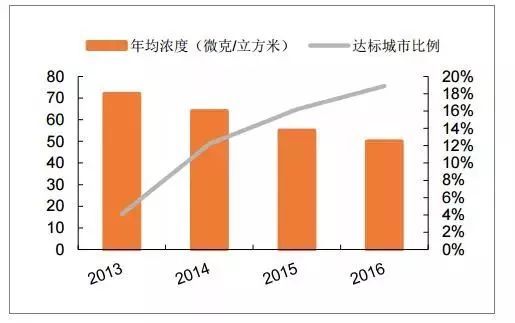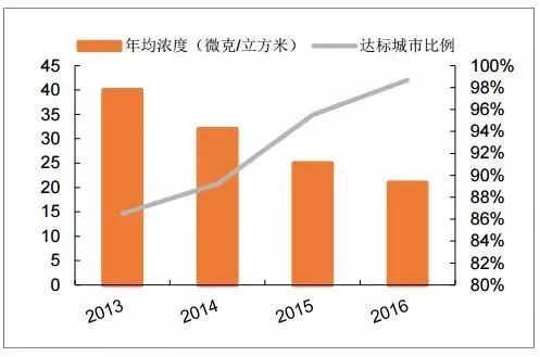 3、我国大气污染物中SO2治理已取得较大进展,PM2.5达标城市比例仍处于较低水平,将是未来治理重点。工业企业排污是造成PM2.5超标的主要原因。2014年,我国火电超净排放标准推出,以颗粒物为例,超净排放标准为10微克/立方米,相比旧标20微克/立方米的特别排放限值下降50%。火电装机主要集中在五大电力集团,易监管且实施超净排放改造有相应补贴,多数情况下可覆盖治理成本,因此推进速度较快。2016年,各电力集团超净排放机组功率占在运营总机组的比例都已达50%以上。截至目前,我们预估火电超净排放改造完成率超过65%,剩余市场空间约140亿元左右。