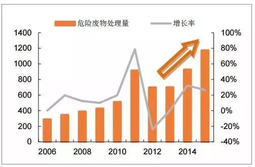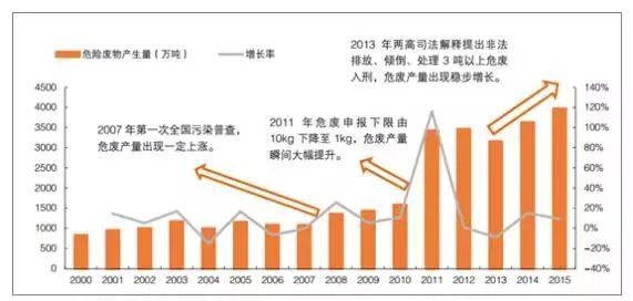4、危废产量巨大,政策监管驱动,需求逐步释放。与生活垃圾成熟的处理模式相比,我国危废处理行业仍处于成长阶段。从行业发展来看,大多数产废企业危废产量有限,但由于危废处理成本较高,再加上过去监管缺失,隐藏、倾倒、丢弃相对容易,瞒报、漏报现象严重,导致危废处理需求得不到有效释放。我们估计,目前我国每年危废产量8000万吨左右,进大于公布的4000万吨。2011年我国危废申报下限从10kg调整为1kg,2013年两高司法解释提出非法排放、倾倒、处理3吨以上危废入刑,在政策的驱动下,危废处理需求开始释放。2018年我国将开启第事轮污染普查,同时环保督察力度、政府监管力度持续加强,供给侧改革背景下企业盈利能力提升,支付意愿变强,在此背景下,危废处理需求将加速释放。