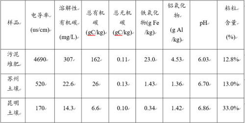 选取我国苏州、昆明的两种典型代表土壤(壤土、粘土)和污泥堆肥为研究对象,对比污泥堆肥与空白土壤的理化特性、重金属总量和形态的差异。研究显示污泥堆肥的有机物和铁水合氧化物的含量均明显高于土壤(见表1),污泥堆肥的长期土地利用可能增加土壤中有机物和铁水合氧化物含量,有利于增加土壤肥力,也有利于重金属固定。污泥堆肥中重金属As、Cd、Cu和Ni的总量为对照土壤含量的2——3倍,长期使用无疑会增加土壤中重金属总量,但是真正影响环境安全的不是重金属总量,而是可浸出释放量。