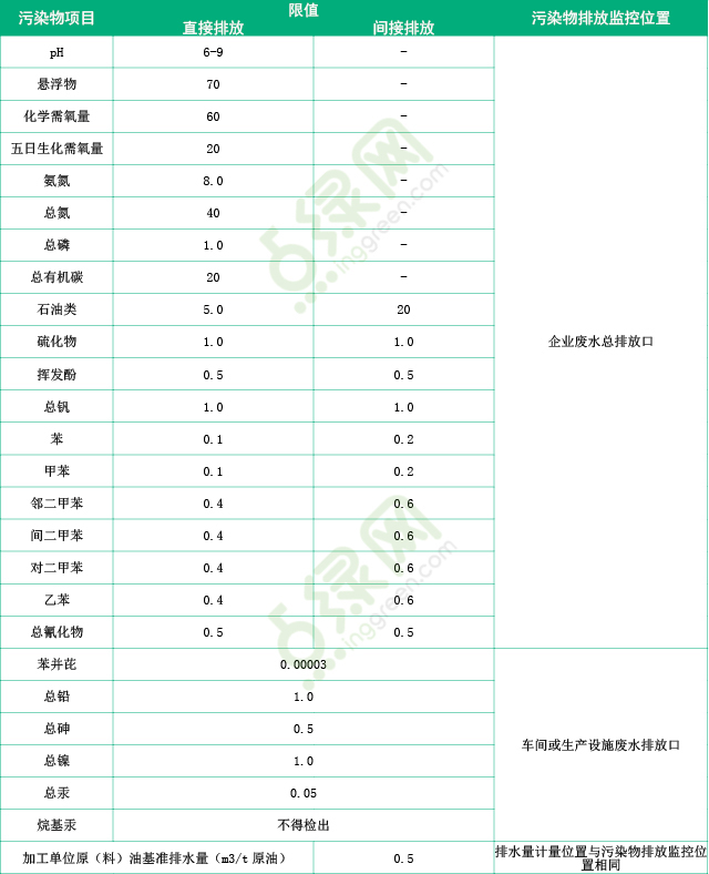 2015年7月1日开始实施的GB31570–2015《石油炼制工业污染物排放标准》和GB 31571-2015《石油化学工业污染物排放标准》,规定了石油炼制工业企业和石油化学工业企业及其生产设施的水污染物和大气污染物排放限值、监测和监督管理要求。其中新建企业石油炼制工业企业水污染物排放标准如表2: