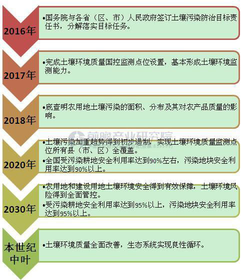 “土十条”对今后一个时期我国土壤污染防治工作做出了全面战略部署,明确定下了未来两个五年计划的目标:到2020年,全国受污染耕地安全利用率达到90%左右,污染地块安全利用率达到90%以上。到2030年,受污染耕地安全利用率达到95%以上,污染地块安全利用率达到95%以上。图表1:“土十条”工作任务与目标