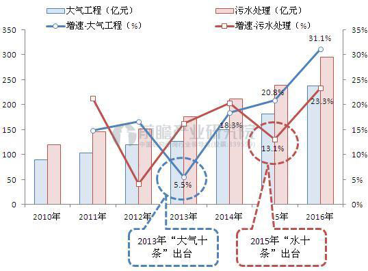 根据前瞻产业研究院发布的《2017-2022年中国环保行业发展前景与投资预测分析报告》数据显示,2013年“大气十条”出台后,2014年、2015年大气污染治理增长率分别为18.3%、20.8%,而2013年这一数值仅为5.5%;2015年“水十条”出台后,2016年污水处理增长率为23.3%。图表2:“大气十条”与“水十条”对大气治理和水处理的影响分析